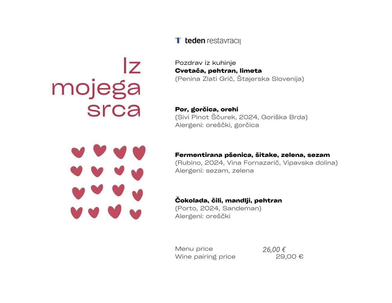 Na meniju boste našli kombinacije, kot so cvetača z limeto in pehtranom, por z gorčico in orehi, fermentirana pšenica s šitakami ter sladek zaključek s čokolado in čilijem.